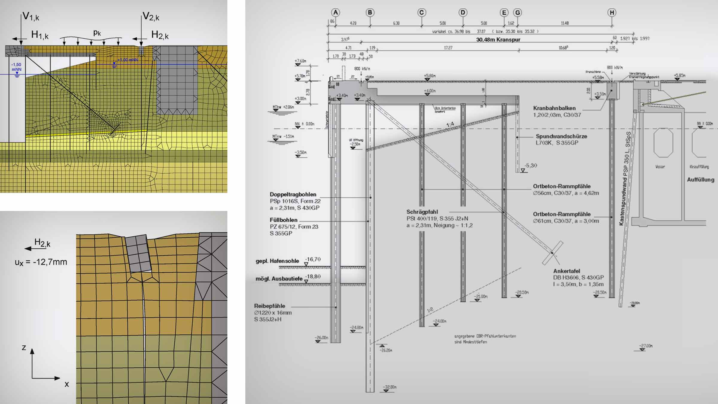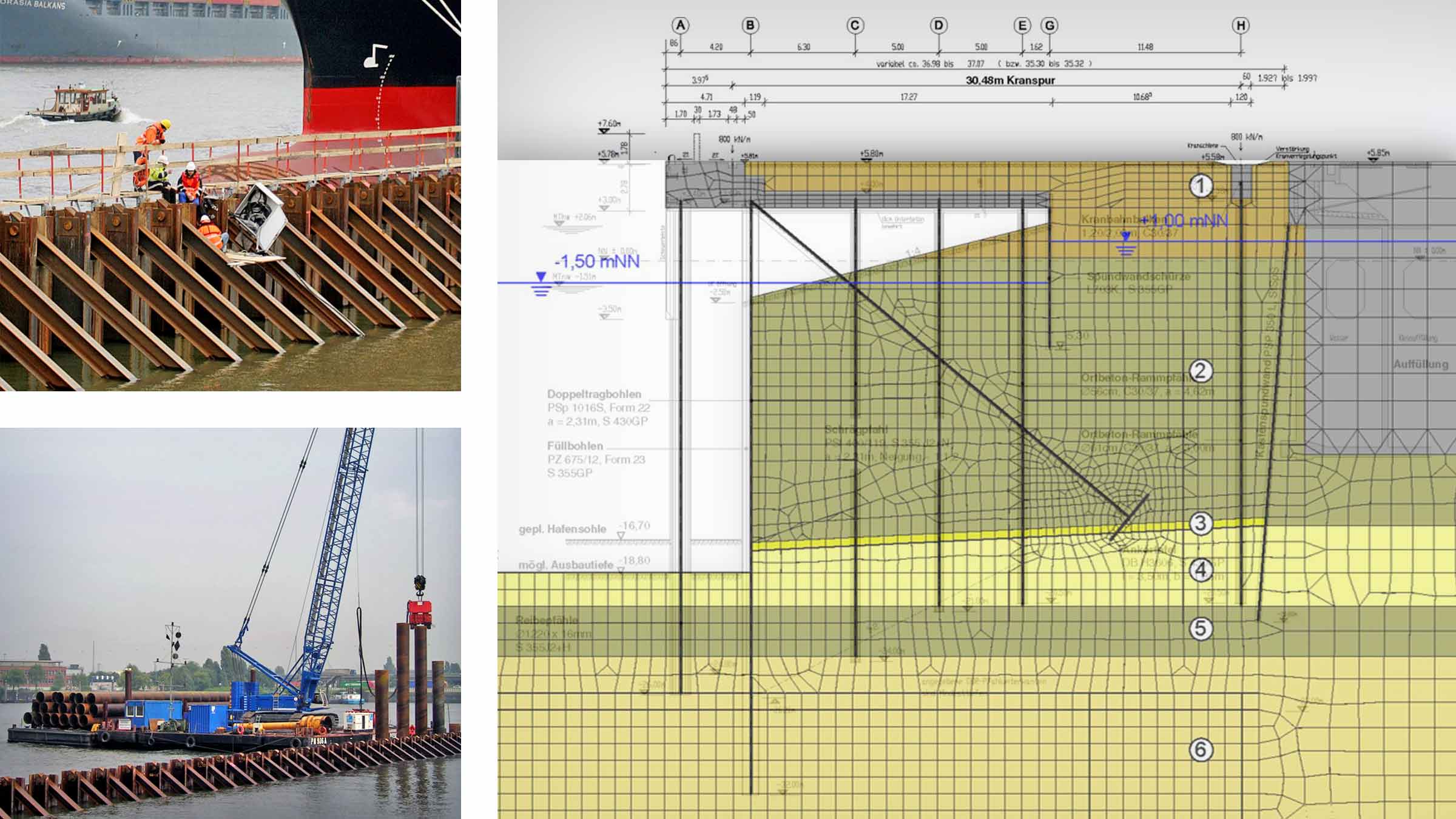 It was necessary to carry out calculations in advance to forecast the possible deformations of this different crane track construction. The calculations were carried out in our own FEM programme BIN-GEO with a non-linear material model. The results of the calculations demonstrated that the deformations in the crane tracks were within the permitted range for crane operations. Thus the planned construction could be implemented as intended.